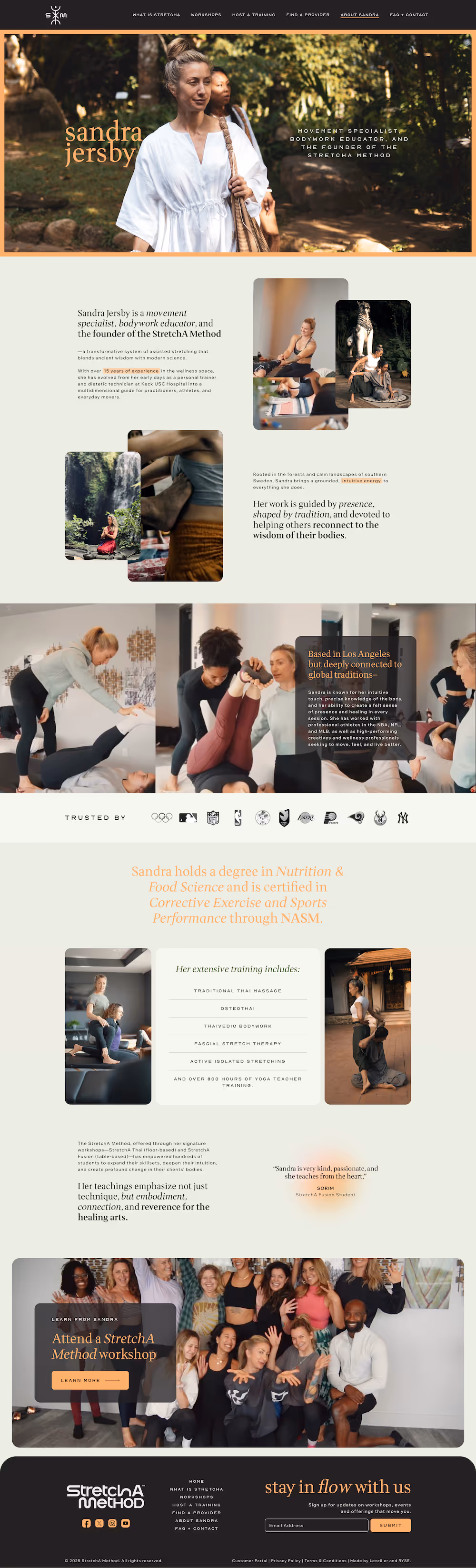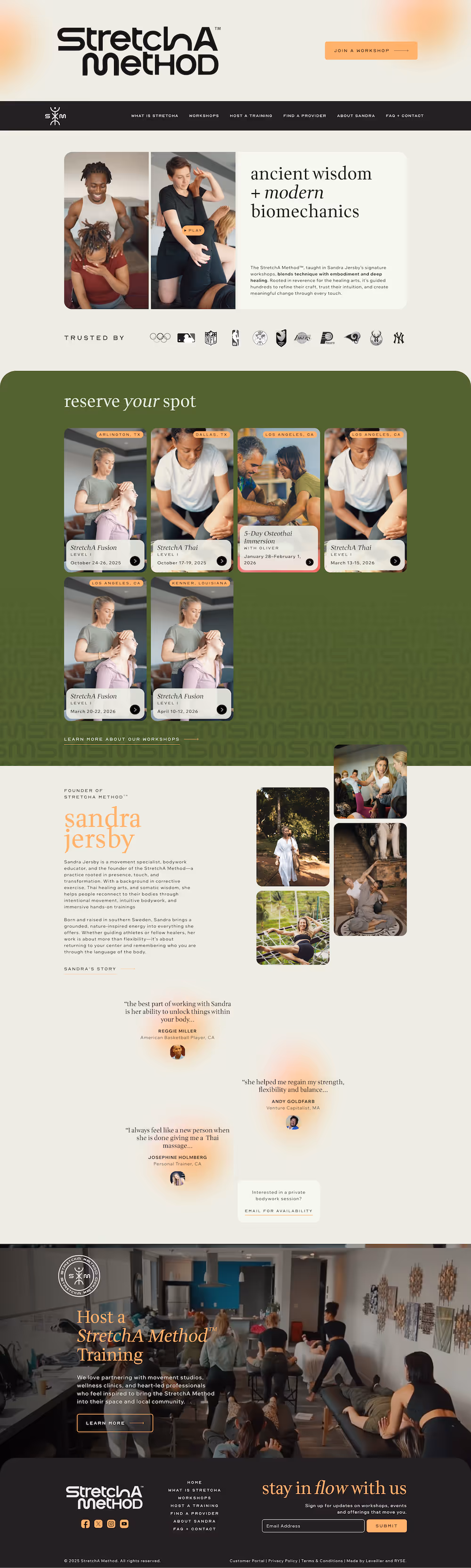 The StretchA Method™, taught in Sandra Jersby’s signature workshops, blends technique with embodiment and deep healing. Rooted in reverence for the healing arts, it’s guided hundreds to refine their craft, trust their intuition, and create meaningful change through every touch.